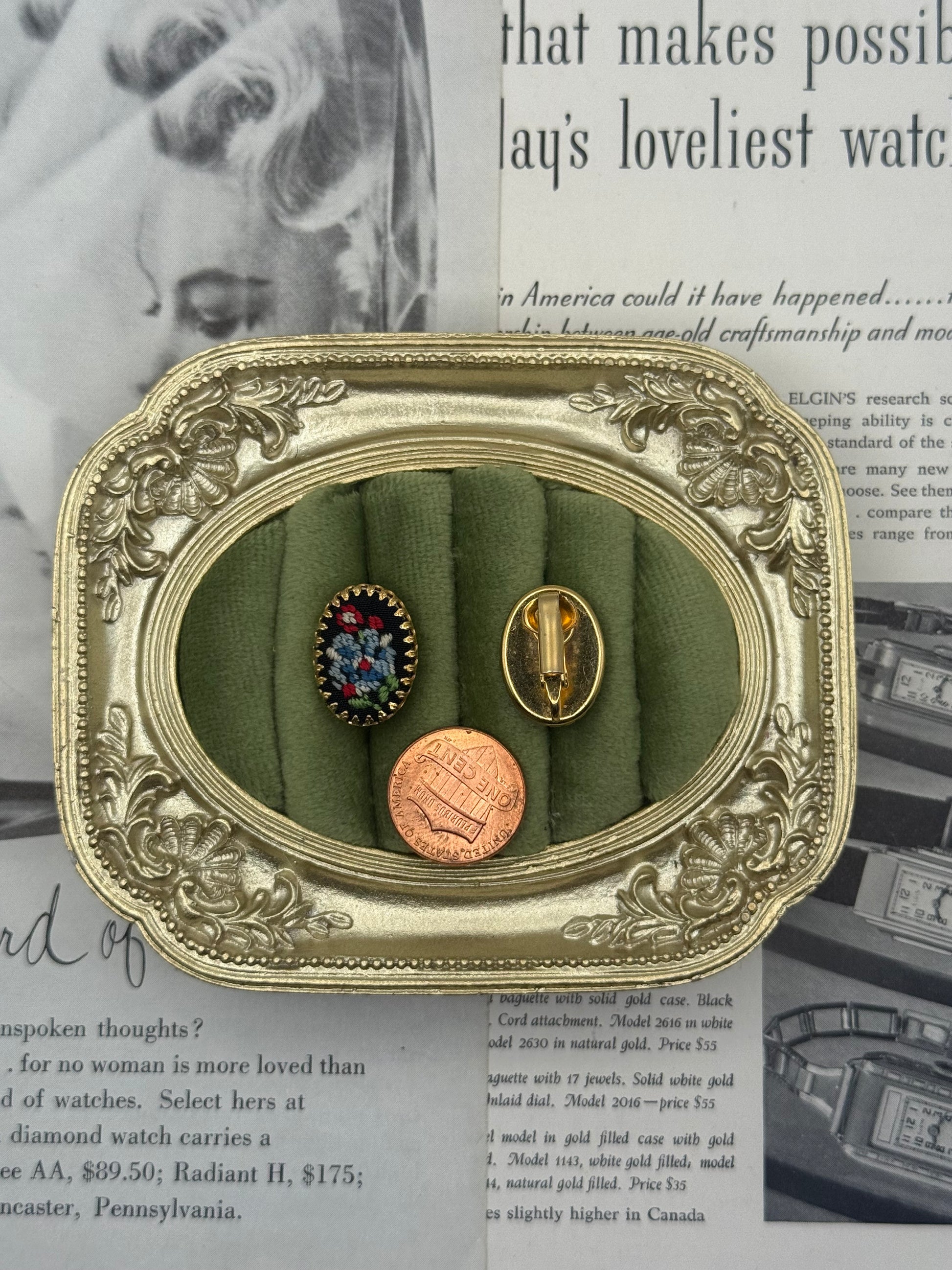 Vintage Gold Tone Needlepoint Clip on Earrings